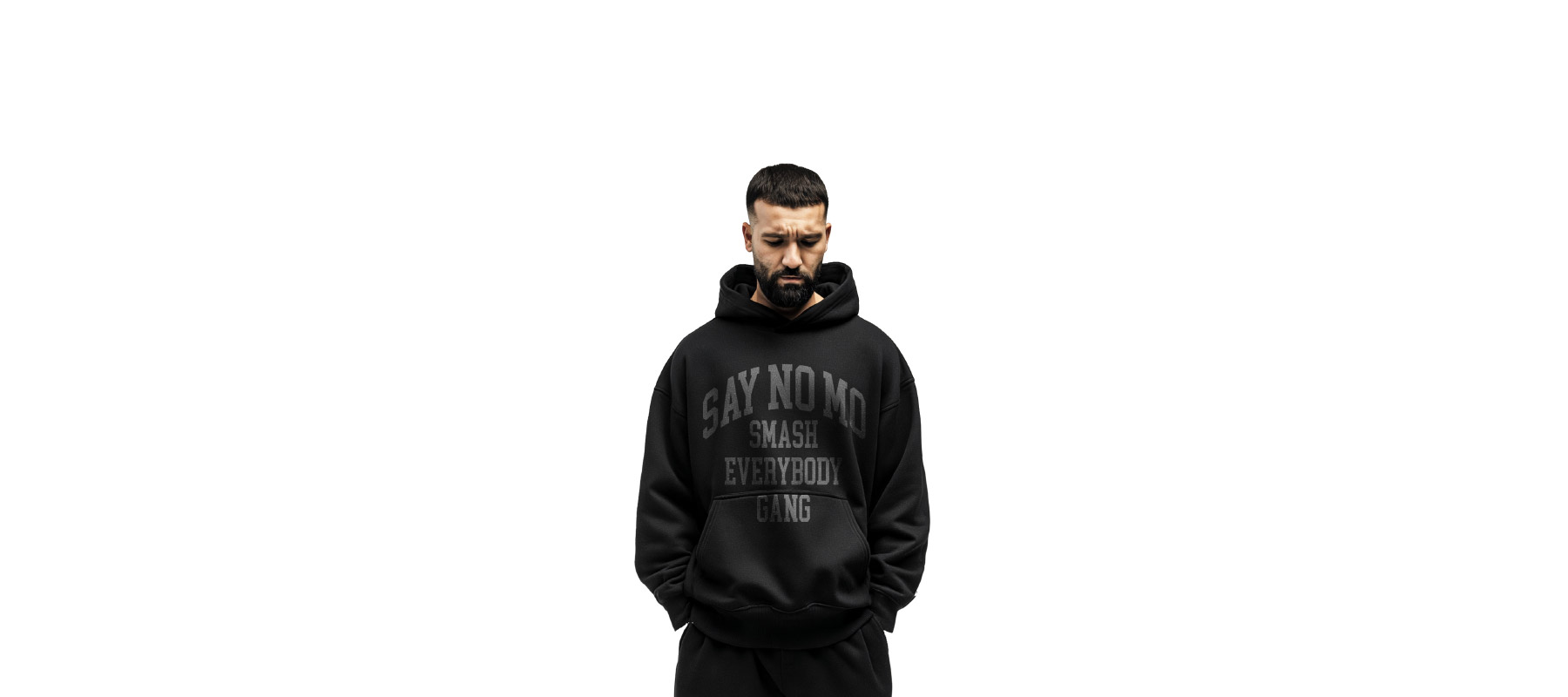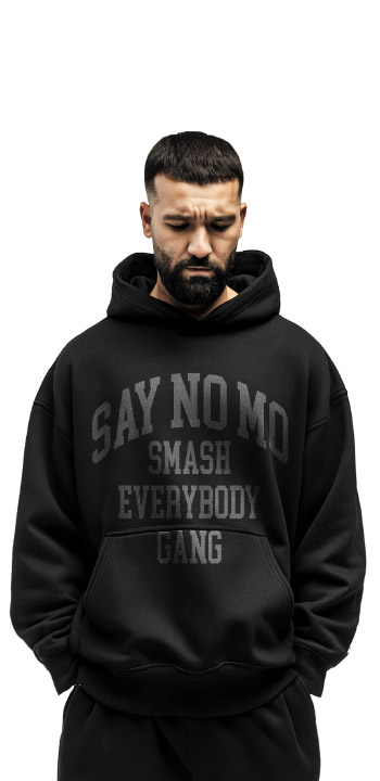 Schwarzer Hoodie mit kleinem Frontprint und großem Backprint Grammatur: 330 g/m² Oversize Fit Aufgesetzte Kängurutasche im Vorderteil Ripp-Bündchen an Saum- und Ärmelsaum